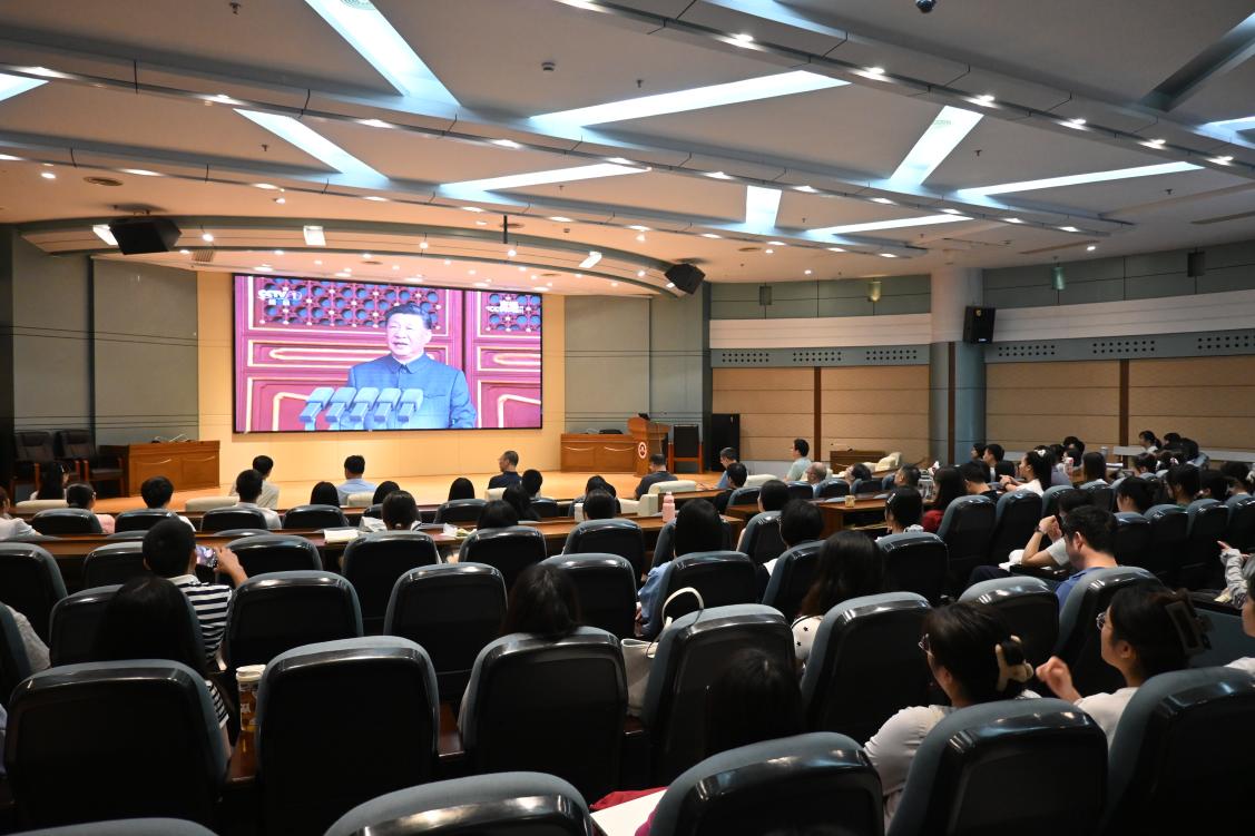 9月3日上午9时,纪念中国人民抗日战争暨世界反法西斯战争胜利80周年大会在北京隆重举行。文学院组织师生党员在邵逸夫楼三楼学术报告厅集体收看直播,其他师生通过电视、网络、广播等多种方式观看,在观礼中回望峥嵘岁月,共同上了一堂生动而深刻的爱国主义教育课。