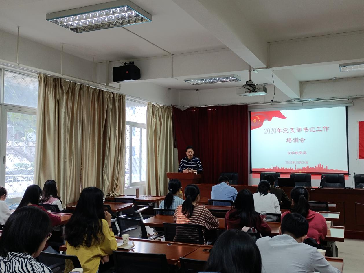 为深入贯彻落实习近平新时代中国特色社会主义思想,进一步加强对学院师生党支部建设工作的指导,切实提升新任支部党支部书记的工作能力。10月28日,文学院党委在邵逸夫二层学术报告厅召开了新任党支部书记培训会,院党委书记李建华、组织员郭静虹和师生党支部书记参加本次培训。